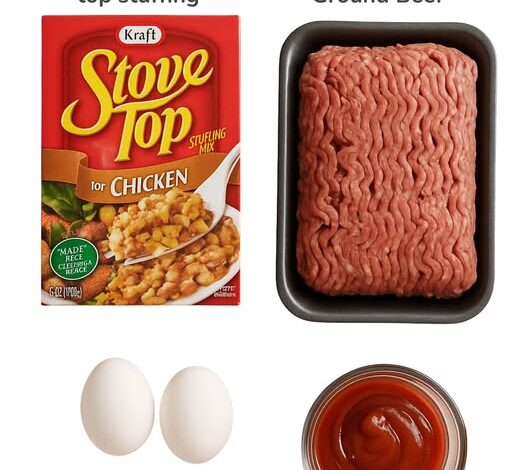 In a large mixing bowl, combine the ground beef, dry Stove Top stuffing mix, eggs, and ketchup.