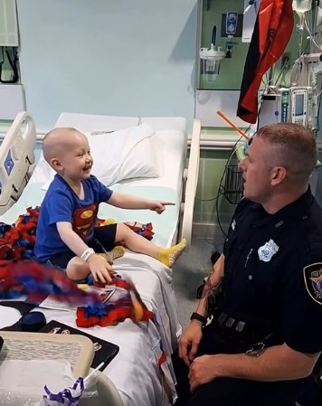 One crisp autumn morning, sunlight filtered weakly through the blinds, casting soft patterns across Ethan’s bed. He had just woken from a long night of chemotherapy when a knock echoed on the door. Expecting a nurse or doctor, Ethan frowned. But when the door opened, he saw an American soldier in a police uniform standing before him, a warm yet commanding smile on his face. The man introduced himself as Sergeant James, a former military officer now serving in the local police department, and explained that he had come not just to greet him, but to bring a “very special surprise.”