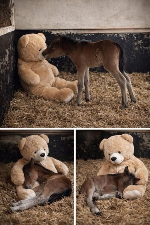 So someone had the gentle idea to place a big teddy bear next to him 🧸 It could not replace his mother, it could not nuzzle him or softly whinny back, but it offered something else — a presence. Something steady. Something to lean against when the silence became too heavy.