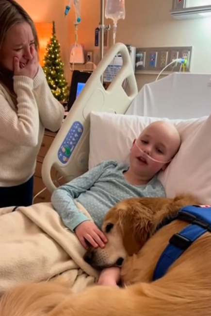 The therapy dog lay perfectly still beside the child. A golden retriever, nine years old, gray frosting his muzzle, chest rising and falling in slow, steady breaths. His head rested near the boy’s arm, close enough to feel warmth through thin hospital sheets.