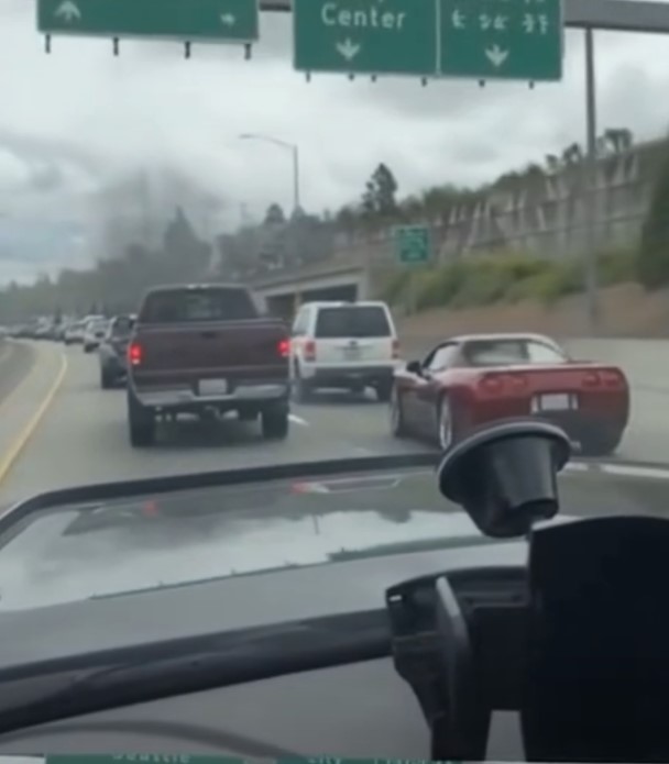 The Corvette driver’s face, partially obscured by sunglasses, reflected a sense of irritation and defiance, as though daring the truck to test his patience further. At this point, the scene had drawn the attention of other drivers, who slowed just enough to watch the unfolding standoff.