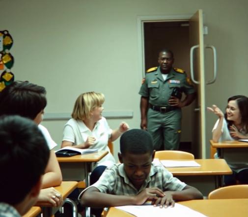 The teacher, unsure of how to respond, nodded awkwardly. The students sat quietly, a sense of anticipation hanging in the air. Ethan, who had been wiping his tears, looked at his father with a mixture of relief and surprise.