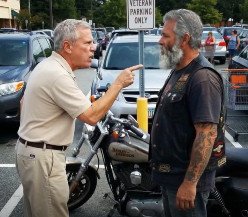 It was a crisp Saturday morning at the grocery store. I watched a biker pull his beat-up Harley into the “Veteran Only” spot like he owned it. No veteran plates. No military stickers. Just a filthy leather vest, a gray beard, and the kind of look that made mothers clutch their children.