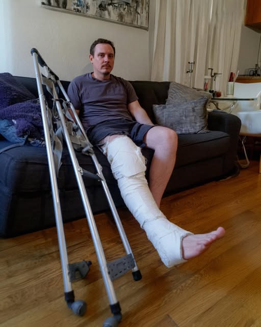 The night before our departure, the excitement in our house was palpable. The girls’ suitcases were zipped tight, and my own mind was already halfway to the Gulf Coast. But then, the front door opened, followed by a heavy, irregular thudding sound in the hallway. When I went to investigate, I found Mark leaning against the wall, clutching a pair of aluminum crutches. His right leg was encased in a thick, stark white cast that reached nearly to his knee.