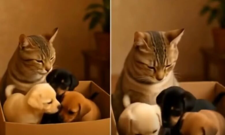 Marsa climbed in beside them, curling her striped body protectively around the group. She began to purr — low, steady, and full of warmth. I stood there speechless. A cat caring for puppies? The scene felt both impossible and deeply touching.