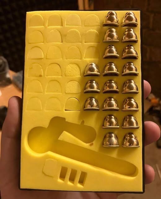 Laser pointer caps came in small packs, often held in foam holders. Crafted from brass or aluminum, each cap contained etched lenses. Snap one onto a pointer, and it warped the beam into shapes.
