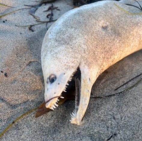 A mysterious sea creature recently washed ashore on a Southern California beach, startling beachgoers with its eerie appearance. The discovery, made near Dana Point, quickly spread online after images were posted to Reddit where the unsettling visuals were even flagged as not safe for work due to the creature’s disturbing, bloated form.