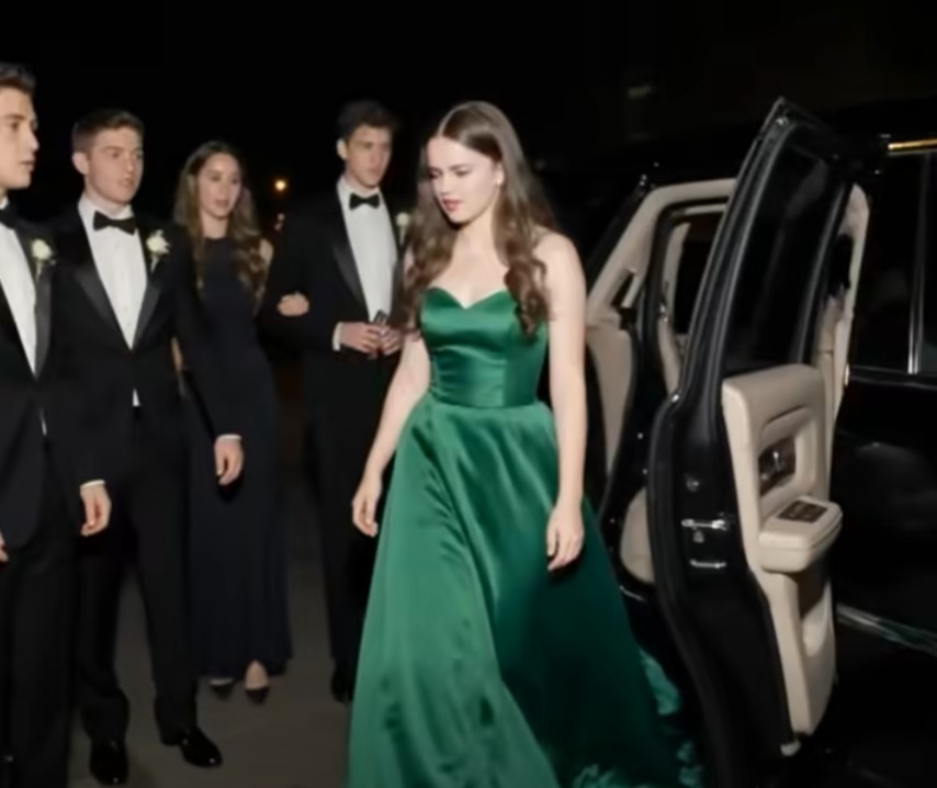 As the limousine pulled up to the grand entrance of Kingsley High, Grace took a deep breath. The driver opened the door, and she stepped out, her emerald gown shimmering under the lights. Conversations halted, and the air was filled with astonished gasps as her classmates turned to see who had arrived in such style.