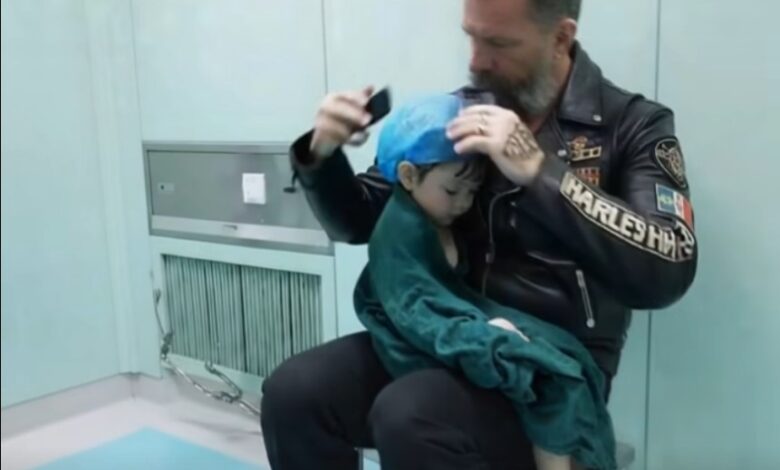 Across the waiting area sat a man I hadn’t noticed before — tall, quiet, dressed in a worn leather vest. His appearance might have intimidated some, but something about him radiated calm. Liam noticed him first. His tired eyes brightened. “Mama,” he whispered, “can I talk to him?”